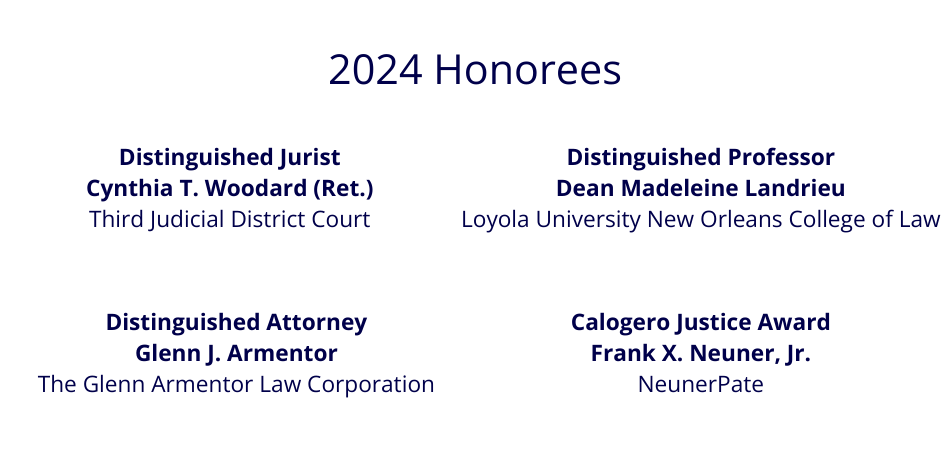 Join us on Friday, April 11, 2025, at the stunning Four Seasons Hotel in New Orleans as we honor our 2024 Distinguished Honorees and the recipient of the prestigious Calogero Justice Award. The LBFs decades of experience as a responsible steward of funds along with our well-established partnerships across all 64 parishes has allowed us to help hundreds of thousands of Louisiana residents gain access to the legal system.
